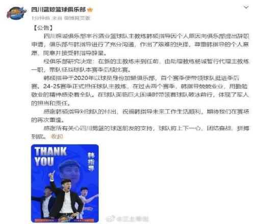 北京時間1月22日,四川男籃在開局17連敗聯(lián)賽墊底后,如今四川男籃官方發(fā)布公告,球隊主帥韓碩指導(dǎo)因個人原因向俱樂部提出辭職申請,俱樂部同意并接受韓指導(dǎo)辭呈,由助教暫時承擔(dān)代理主帥職責(zé)。